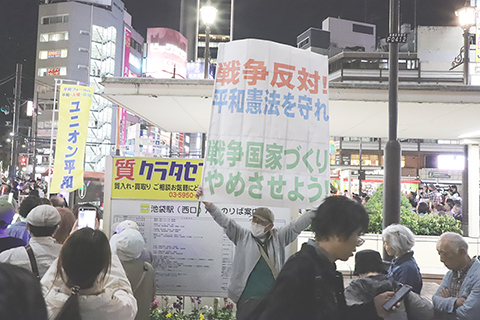 日本在野黨和民眾集會反對高市政府為武器出口「鬆綁」 2026-04-07 03:30:00 ◎ 四月五日晚,人們在日本東京池袋站前的集會現場手持標語抗議高市政府為武器出口「鬆綁」。(新華社記者 李子越 攝)