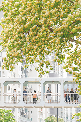 ◎ 四月七日,香港太子道西兩側的魚木花競相開放,吸引市民駐足欣賞。(中新社記者 張祥毅 攝)