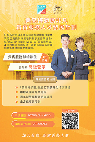 如欲了解計劃詳情,可瀏覽勞工局網站內相關專頁:https://www.dsal.gov.mo/zh_tw/standard/mgm2026_pg1.html,有意參加者可於今(二十一)日起至四月三十日期間遞交網上申請。申請期結束後,美高梅將陸續通知符合條件的申請人出席五月十三日舉行的講座及隨即安排面試,並向出席者詳細說明計劃的各項培訓內容及職業生涯發展路徑。