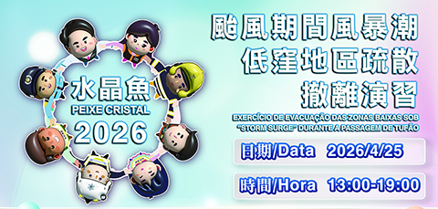 【特訊】隨著本澳颱風季節即將來臨,為強化社區防災意識,民防架構將於四月二十五日星期六下午一時至七時,進行代號「水晶魚二零二六」民防颱風演習。