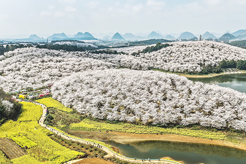 貴州:櫻花似海 春滿大地 2026-04-25 03:31:00 近日,隨著氣溫回升,貴州省貴安新區櫻花園內的二點四萬畝櫻花迎來盛花期。如雲似霞的櫻花和山川、湖泊、民居構成一幅幅美麗的春日畫卷,吸引眾多遊客前來觀光遊玩。(新華社記者 陶亮 攝)