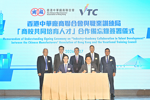 ◎ 香港首份五年規劃正在編製中,四月廿七日,香港中華廠商聯合會舉辦「『十五五』規劃與香港的新機遇」高峰論壇,邀請政、產、學、研等界別重量級領袖,從多元視角深入解讀「十五五」規劃對香港的深遠影響,並探討香港怎樣把握機遇、發揮優勢,因地制宜制定和推行中長期產業發展規劃,主動融入及服務國家發展大局中實現新躍升、譜寫新篇章。圖為香港中華廠商聯合會會長盧金榮(前排左)和職業訓練局主席林健鋒(前排右)簽署「商校共同培育人才」合作備忘錄。(香港中通社)