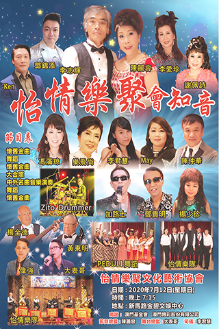 怡情樂聚文化藝術協會於七月十二日(星期日)晚上七時十五分,假新馬路金碧文娛中心舉行演出活動,節目十分豐富,包括樂隊演奏中外名曲,民族舞蹈,懷舊金曲,結他彈唱等。參加演出者有李志輝、陳麗容、楊全德、陳群英、陳群好、黃東明、李君慧、鄧錦添、謝佩詩、陳仲華、李愛珍、偉強、大表哥、加路士、May、Ken、樂飛尚、馮滿琼、鄧貴明、楊少珍。歌曲有:漫步人生路、甜言蜜語、金碧靚女多、情花開、地久天長、昨夜你對我一笑、親情、笑傲江湖、鐵血舟心、問誰領風騷、賭仔自嘆、欲斷難斷、雪中情、夏日寒風、似水流年。……歡迎市民前來欣賞。該活動獲得澳門基金會贊助。◇
