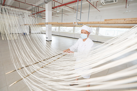 探訪貴州綏陽空心麵製作技藝 2021-07-08 03:30:00 ◎ 七月七日,貴州綏陽,空心麵製作技藝傳承人張發喜在抻麵。貴州省遵義市綏陽縣空心麵因麵條空心而得名,其歷史悠久,製作考究,需要經歷和麵、開條、上桿等七十二道製作工序,具有纖細、味美、久煮不爛等特點。空心麵製作技藝已被列入貴州省第四批非物質文化遺產名錄。(中新社)