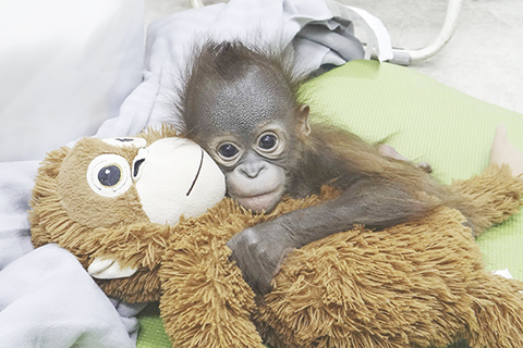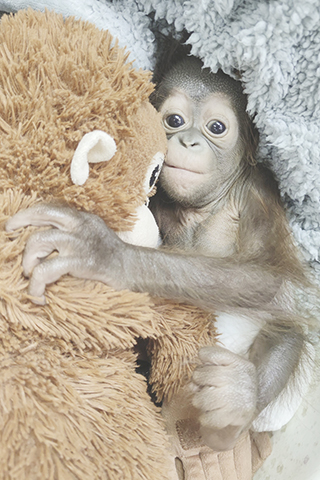 ◎ 本月十九日是世界紅毛猩猩日,北市動物園人工哺育的紅毛猩猩寶寶「秀彩」發育良好、喜迎「雙滿月」,還會環抱著保育員特別準備的「媽媽娃娃」睡覺。