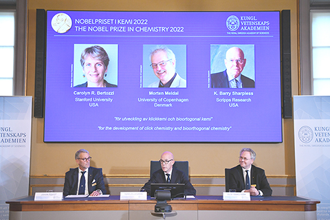 【香港中通社十月五日電】北京時間十月五日下午,在瑞典首都斯德哥爾摩,瑞典皇家科學院宣佈,將二0二二年諾貝爾化學獎授予美國化學家卡羅琳.貝爾托西(Carolyn R. Bertozzi)、丹麥化學家摩頓.梅爾達爾(Morten Meldal)和美國化學家卡爾.巴里.夏普萊斯(K. Barry Sharpless),以表彰他們在點擊化學和正交化學研究方面的貢獻。