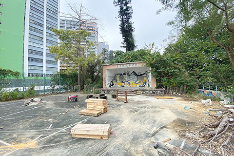 我們從後門走進去,走廊上都擺放著一些建築物品,在後門的兩側各有幾個房間,裡面沒有什麼雜物或垃圾,只放了一些工程用的鐵馬或材料,但窗戶及房門卻已經給全部拆去,驟眼看去,就像是兩列包含著很多個大洞的課室,而課室的裡裡外外都滿佈著塗鴉。入到學校的範圍,它是單幢的平房式校舍,整體呈長方形,操場在中間,兩邊各有一列平房式的課室,盡處是一個像表演台的開放式紀念堂。這個環境讓我們看了感到很眼熟,因為曾經在電視節目上看到過。操場上劃分為兩個籃球場,有一個籃球架還在那裡,操場兩側的校舍,一邊的較長,另一邊的較短。較短的一邊在校舍之外有一張石製的乒乓球桌,再遠一點的地上卻躺卧著一個籃球架。而較長的一邊的校舍,在接近末處是多間有人名的紀念室,如查濟民紀念室、陳永華紀念室、楊晉培紀念室、鄭植之紀念室等。之後是一個雜物室及廚房,再走遠是一個小樹林,但樹林內卻建有男廁和女廁,而兩組廁所只相隔了一條小巷,廁所內已經破爛不堪,而牆壁、廁所門乃至鏡子,還是可以看到塗鴉的。