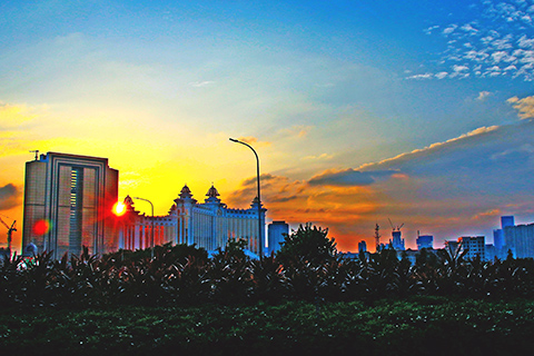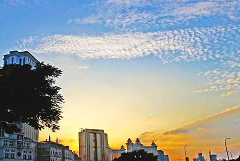 有日傍晚,我坐在友人的車上,經過路氹連貫公路圓形地時,被車窗外的夕陽金光所吸引,從車窗望向西邊的角度,我趕緊拍下這一瞬間的金色。只見落日把它最後的光芒灑向了「銀河」的上空,車在行進中,金光閃爍在樹梢間,光芒無處不在,夕陽旁邊的雲霞色彩變化也給人帶來了安詳和快樂,以紅彤彤的笑臉向我們作一天最輝煌的告別。而遠處的橫琴山那好似被夕陽蒙上了朦朧的一層粉色面紗,溫柔地包裹著大地,讓天空也陶醉在半黃、半粉、半紫、半藍中,準備迎接那恬靜的夜。