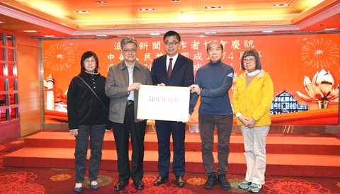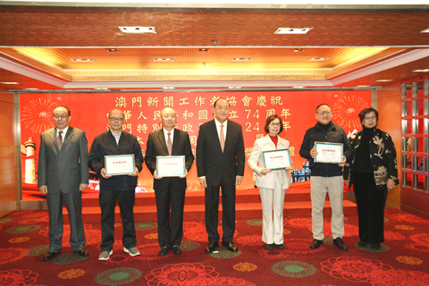 【特訊】澳門新聞工作者協會昨舉辦慶祝中華人民共和國成立七十四周年、澳門特區成立廿四周年、該會五十五周年會慶暨本年度會員服務年資獎頒獎禮,行政長官賀一誠出席主禮。記協理事長胡根稱,明年是中華人民共和國成立七十五周年、澳門特區成立廿五周年,澳門新聞界定當踔厲奮發、勇毅前行,傳播時代強音,講好澳門故事,以新的發展成績迎接澳門回歸廿五周年。