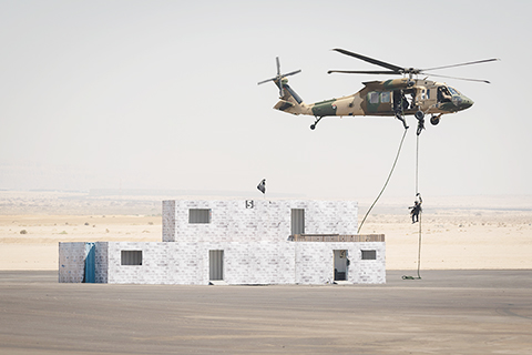 約旦舉辦第十四屆國際特種作戰部隊武器裝備展 2024-09-05 03:30:00 ◎ 第十四屆約旦國際特種作戰部隊武器裝備展9月3日在約旦南部港口城市亞喀巴開幕,來自73個國家的300多家國防和安全行業的公司參展。約旦國王阿卜杜拉二世參加了開幕式,並觀看了約旦皇家特種部隊在亞喀巴國際展覽中心進行的演練。圖為當日,在約旦南部港口城市亞喀巴,約旦皇家特種部隊在開幕式上演練。(新華社發 約旦王宮供圖)