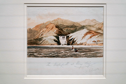 ◎ 威廉.哈維的水彩畫《香港仔附近的瀑布》,該畫作大約創作於一八一六年,是香港最早的圖像記錄之一。當年,英國使節船隊曾在南丫島東北部水域短暫泊碇,附近的香港島西南部有一道瀑布,船員乘小舟前往瀑布取水。外國人對香港的認識,可說是由這道水源開始。與這幅畫有關的外國使團之行成了香港歷史的轉折點。畫中的地方是現今香港島香港仔的瀑布灣,瀑布仍在,但水勢因修建薄扶林水塘而大減。(中新社記者張煒 攝)