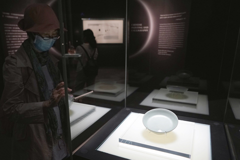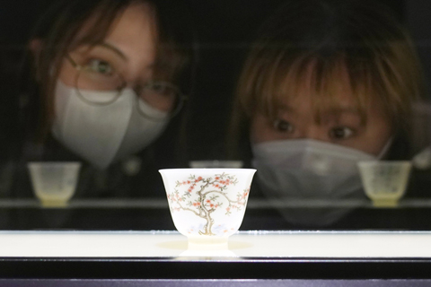 ◎ 觀眾被清康熙御製「十二花神杯」的三月桃花杯吸引。該套宮廷用瓷共計十二件,分別以農曆月份和對應的花卉為主題。胎質纖薄,畫工細緻,杯身一面以黑彩勾勒紋飾,再以鈷藍和其他彩料繪畫代表各農曆月份當令的花木,杯身背面以青花楷書寫上五言或七言咏贊詩句,將詩、書、畫、印融於一體,猶如一部花卉圖册,與詩句相映,蘊含文人雅趣。該套花神杯是香港已故企業家、收藏家羅桂祥舊藏,一九八一年,羅桂祥將十二花神杯連同他的陶瓷茶具藏品悉數捐贈予政府。完整的十二花神杯實屬罕見,現時祗有北京故宮博物院、大英博物館和紐約大都會藝術博物館等少數博物館存有成套。(中新社記者張煒 攝)