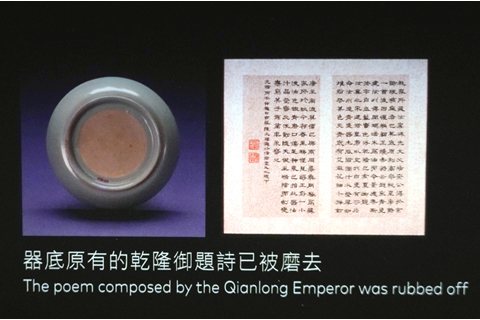 ◎ 北宋汝窑青釉筆洗器底題詩被磨去。該汝窑瓷器是香港已故企業家、收藏家羅桂祥舊藏,後捐獻予藝術館。這件筆洗曾被乾隆收藏,底部原刻有一首乾隆御題詩:「趙宋青窑建汝州,傳聞瑪瑙末為油,而今景德無斯法,亦自出藍寶色浮。」清人陳瑞安於北京琉璃廠獲得後,因怕藏有御瓷會被降罪而磨掉了題詩。二0一七年10月,在香港蘇富比拍賣會上,一件與之類似的北宋汝窑天青釉洗以二億九千四百萬港元天價成交,打破了中國瓷器的世界拍賣紀錄。(中新社記者張煒 攝)