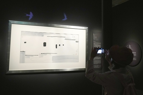 ◎ 觀眾欣賞吳冠中的代表作《憶江南》。《憶江南》是吳冠中經典作品《雙燕》的姊妹作,與《秋瑾故居》合稱為「三步曲」,見證了吳冠中藝術生命中由具象邁向抽象的探索歷程。畫作以簡約而近乎抽象的塊面結構和黑、白、灰的運用,來表現江南粉牆黛瓦的民居。畫中的房屋與門窗都已化成點、線、面的節奏,體現了吳冠中對抽象美的最終追求。畫面右上方的一雙飛燕和下方代表水波的迴旋線條不但加強作品空間感,同時亦把觀眾由抽象的境界帶回現實。(中新社記者張煒 攝)