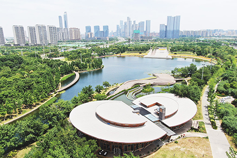 ◎ 六月七日,航拍南京河西城市生態公園。該地森林、濕地、湖泊、橋樑等多重景觀為市民提供休憩空間,打造「新城綠肺」。(中新社)
