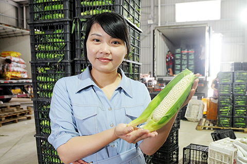 ◎ 一九八五年出生的韓珠卿,於二00九年畢業於福建工程學院,二0一六年辭去國企工作回到家鄉福建省漳州市南靖縣山城鎮,在線上銷售青棗等當地特色農產品,也做水果玉米「微商」。幾年來,韓珠卿帶動村民種植「水果玉米」,農民增收創收;發展訂單農業,打造線上、線下農產品全供應鏈,助力當地涉農產業發展。圖為六月三日,韓珠卿展示「水果玉米」。(中新社)