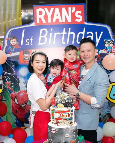 可愛的Ryan塊面肥嘟嘟,夫婦二人親吻壽星仔,錫得非常肉緊,被錫到面型扭曲嘅Ryan一臉唔情願扁晒嘴,杏兒開心地留言:「今日是個很特別的日子,Ryan的一歲生日,Daddy第一次和兩個小朋友過父親節,Brendan可以跟他最喜愛的IronMan玩,在Cafe內和很多小朋友一齊玩,食了好多啫喱,感恩身邊有朋友,家人,多謝今天來慶祝的朋友,祝大家父親節快樂!」◇