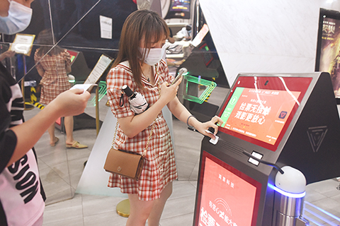 記者在天河電影城看到,現場嚴格遵從防疫準則,工作人員戴上一次性手套進行檢票工作;同時,在檢票處放置有穗康小程序二維碼、測溫槍、酒精消毒液,每位觀眾進場前必須完成掃碼、測溫、消毒三道程序。