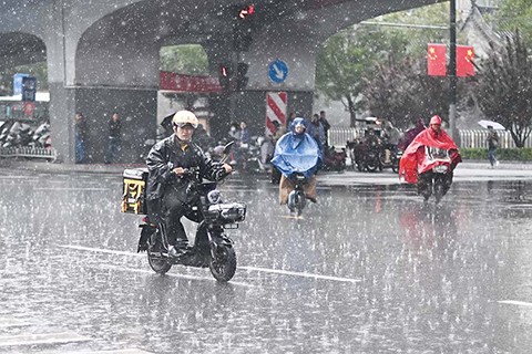 ◎ 九月二十三日下午,山西太原突降暴雨,市民冒雨出行。當日十五時,太原氣象台連續發佈雷電黃色預警和城市內澇藍色預警。(中新社)
