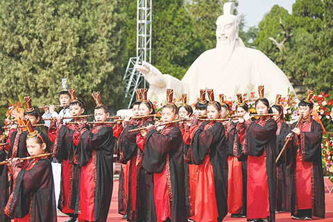 ◎ 十月二十五日,山西運城,庚子年恭祭虞舜聖帝大典在鹽湖區舜帝公園古柏廣場舉行。圖為現場樂舞告祭表演。(中新社)