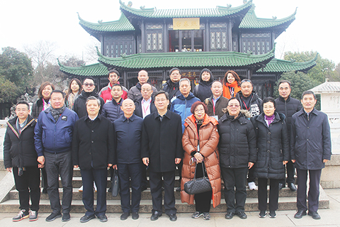 千年古剎大明寺,是揚州地區現存最古老和保存最完好的寺院。一行到達後,寺院方丈能修在山門前等候。合影留念後,能修領著一行瞻仰了大雄寶殿,並登上高聳入雲的佛塔,瞭看揚州冬日裡的景象。能修方丈和團長陸波還互贈墨寶,能修書寫的是「歡喜無量」;陸波書寫的是「人和」。能修方丈還向大家贈送了手書的「福」字掛屏,大受歡迎。◇