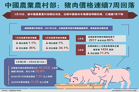 ◎ 三月十八日,據中國農業農村部網站消息,近期中國豬肉市場價格明顯回落,已連續七周下降。(中新社)