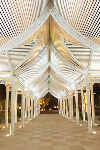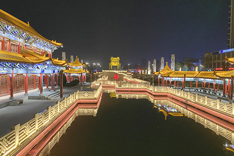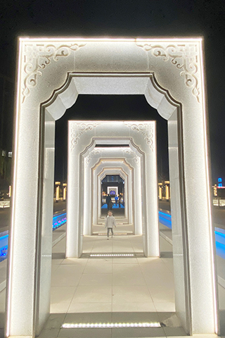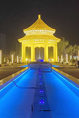 中阿之軸其實就是一道景觀道路、尤其燈光下更是一道亮麗的風景線;東起萬壽路、西接親水大街,長達2100米、寬數十米的景觀大道劃分為人文景觀區暨中阿友好標誌景觀區、中阿文化交融景觀區、中國回族文化景觀區;不僅展現了阿拉伯國家悠久的歷史文化、還寓意著兩國友誼源遠流長。高高的紀念碑倒印在清澈的水面、顯得異常寧靜,前方是座八角亭子、接著是充滿阿拉伯氣息的迴廊與雕塑,再往前就是古色古香的傳統建築,霓虹燈下的亭、臺、樓、閣、迴廊,顯得特有韻味。若你來銀川,不妨晚上到此一遊。◇