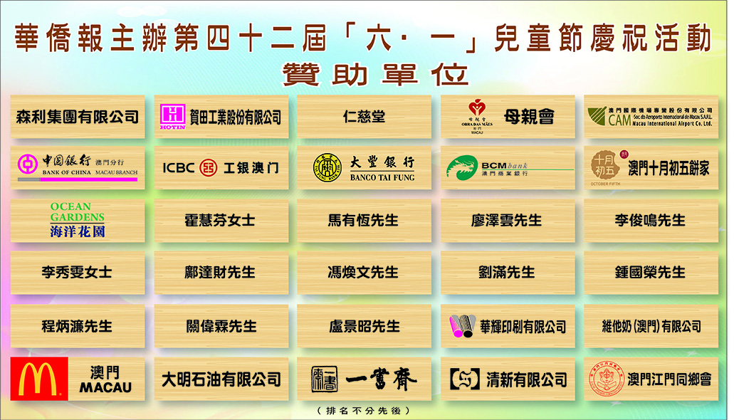 本報舉辦的第四十二屆「六.一」兒童節慶祝活動,透過抽籤方式派發禮物,前四十名可獲獎學金及豐富禮物,第四十一名至五十名可獲特別禮物一份。其他所有得獎者均可獲本報兒童節獎品一份。得獎者請於六月一日至十五日上午十時至下午五時到本報營業部領取禮物,領取禮物時攜同澳門居民身份證及學生證,以便核對。
