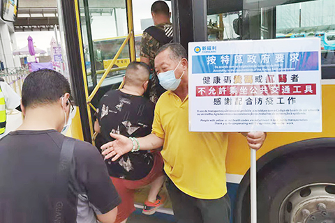 【特訊】 因應新型冠狀病毒疫情變化,按特區政府要求,為保障乘搭公共交通工具乘客之健康,健康碼黃碼或紅碼者不允許乘坐公共交通工具,包括巴士、的士及輕軌。巴士和的士司機有權查閱乘客健康碼,並可拒絕接載黃碼或紅碼乘客。所有搭乘公共交通工具人士仍須全程佩戴口罩,否則車長及車務人員有權拒絕乘客使用相關服務。新福利今早加派人手到各個站頭執行新措施,站長檢查排隊候車乘客的健康碼,同時舉牌提示持黃、紅碼者不允許乘坐公共交通工具,新措施實施後,執行情況大致順暢,乘客自覺配合。