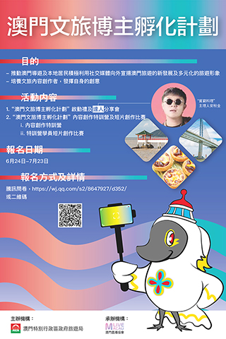 【特訊】為鼓勵澳門市民及旅遊業界善用社交媒體推廣澳門多元化的旅遊形象,澳門特別行政區政府旅遊局推出「澳門文旅博主孵化計劃」,活動包括達人分享會、內容創作特訓營及特訓營學員短片創作比賽,達人分享會和內容創作特訓營均自今(二十四)日中午十二時起接受報名,歡迎有興趣人士參加。