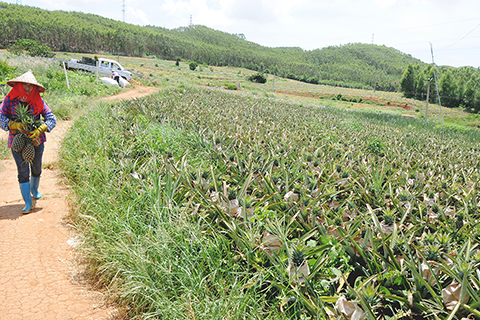 當天上午,記者見到了曾熒煊。他戴著一副眼鏡,白髮過半,皮膚曬得黝黑,有台商朋友笑稱他為「鳳梨伯」。在鳳梨農場內,他正忙著與工人在田間檢查鳳梨的成熟程度。他掀開黑色遮陽布,欣喜地告訴記者:「這個西瓜鳳梨可達八斤重,品種不錯,今後將重點推廣這個品種。」