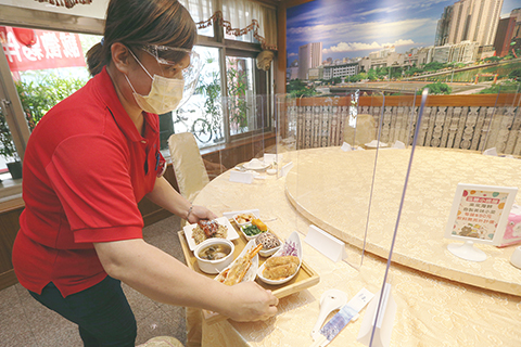 本月廿四日,台灣高雄一家海產燒烤餐廳在餐桌上放上透明隔板,並以個人套餐出菜,盼望解禁後能迎來久違的老顧客。台灣流行疫情指揮中心宣佈本月廿七日起降級為二級警戒,高雄市部份餐廳、速食店開始規劃民眾內用,餐飲業者人員除了要自主健康管理、環境清消外並戴好口罩外,餐廳要內用座位區要有「ㄇ」字型三面式隔板、不同桌距一點五公尺以上距離,餐點以個人套餐或合餐方式,禁止共食,高雄一家海產燒烤業者表示已經等這天很久了,這幾天開始重新對營業場所進行消毒,還自主添購快篩試劑替員工快篩,各項防疫措施也都符合規定,一切準備就緒盼望解禁後能迎來久違的老顧客。(香港中通社圖片)