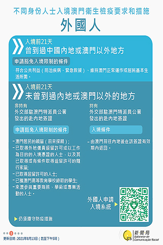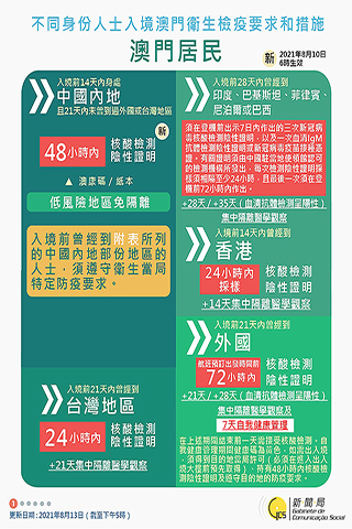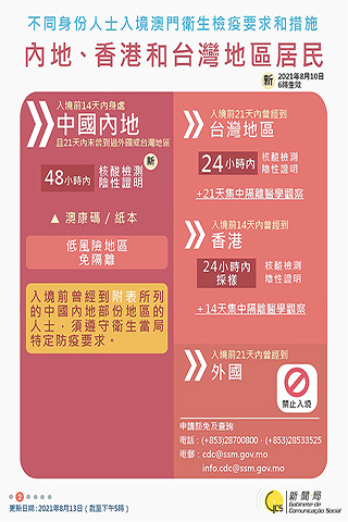 【特訊】新型冠狀病毒感染應變協調中心宣佈,因應遼寧省、四川省、福建省、廣東省和重慶巿的疫情變化,衛生局根據第二/二00四號法律《傳染病防治法》第十條和第十四條的規定,自二0二一年八月十三日晚上九時起,取銷曾經到過遼寧省瀋陽市、大連市,四川省綿陽市涪城區吳家鎮惠科路一號廠區、成都市、宜賓市南溪區南溪街道,福建省廈門市(包括廈門高崎國際機場),廣東省珠海市(和七月二十五日珠海市診斷感染者有共同軌跡者)或重慶巿江津區雙福街道的人士須按照衛生當局的要求在指定地點接受醫學觀察至離開當地後十四天但最短不少於七天或其健康碼變為黃碼及須接受自我健康管理至離開當地十四天為止,期間須在開始措施的第一、二、四、七、十二天接受最多五次的新冠病毒核酸檢測的相關措施。