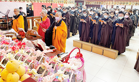 在清淨莊嚴的觀音聖號聲中,澳門禪淨中心妙為法師領眾獻供,把468份供品呈獻在佛前,念念感應觀音心;爐香乍熱,恭請住持覺仁法師主法,唱誦〈楊枝淨水讚〉,祈願三寶垂降,願菩薩甘露遍灑,清洗內心的無明汙垢,令清淨本性顯現,亦為世界祈願,祝福大眾身心自在。