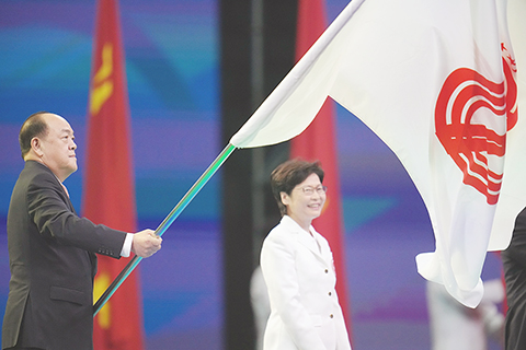 【特訊】由國家體育總局主辦、陝西省人民政府承辦的中華人民共和國第十四屆全國運動會,九月二十七日晚上八時於西安奧體中心體育館舉行閉幕式,國務院總理李克強在儀式上宣佈全運會閉幕。行政長官賀一誠與廣東省省長馬興瑞及香港特別行政區行政長官林鄭月娥參加了第十五屆全國運動會會旗交接儀式。