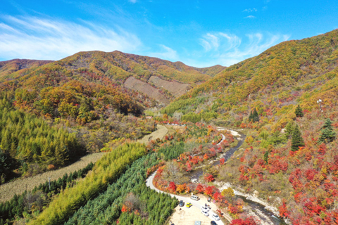 ◎ 十月十三日,位於遼寧省丹東市寬甸滿族自治縣縣城東部的三道灣生態旅遊景區,山水環繞,層林盡染。圖為無人機拍攝三道灣生態旅遊景區。(無人機照片)