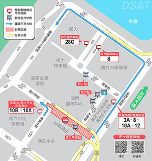 巴士方面,本月五日(周六)首班車起至四月二十三日(周六),「馬六甲街」及「回力」巴士站暫停使用,水塘巷設立臨時巴士總站。3A、8、10A、10B、10X、12及28C路線巴士需改道行駛及臨時停靠其他站點,而56路線則改道行駛但停靠站點不變。詳情可查閱澳巴網頁http://www.tcm.com.mo/web/NewsVB/data/782_cn.pdf及新福利網頁https://www.transmac.com.mo/route-change/tr-047-2022/。