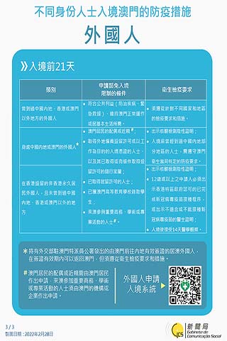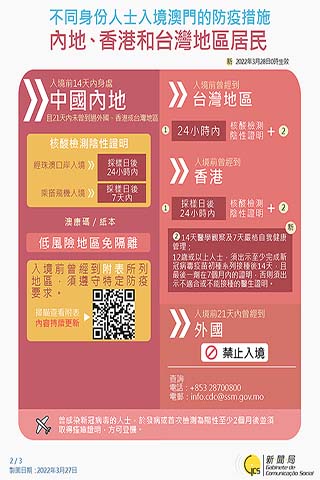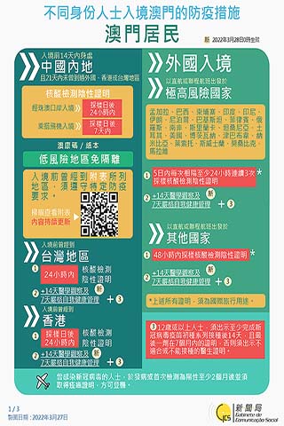【特訊】新型冠狀病毒感染應變協調中心(下稱應變協調中心)宣佈,因應內地的疫情變化,衛生局根據第2/2004號法律《傳染病防治法》第10條和第14條的規定,自2022年3月28日凌晨1時起,所有曾經到過以下地點的入境及已入境人士,須按照衛生當局的要求在指定地點接受醫學觀察至離開當地後14天但最短不少於7天:福建省泉州市石獅市祥芝鎮後湖村大宏公司公寓四區、湖濱街道曾坑社區紅日路5號鑫源公寓、錦尚鎮厝上村五片區4號樓、靈秀鎮香江路1685-1687號棟樓;遼寧省瀋陽市遼中區茨榆坨街道,大連市金普新區七頂山街道陸海村陸海小區7號、普蘭店區豐榮街道久壽社區中心路一段49號和太平街道如意人家鈺蓮園小區10號樓;河南省焦作市修武縣王屯鄉前南孟村,漯河市臨潁縣台陳鎮台陳村、新城街道辦事處轄區;天津市東麗區金鐘街春江里小區;上海市浦東新區北蔡鎮御北路235號。