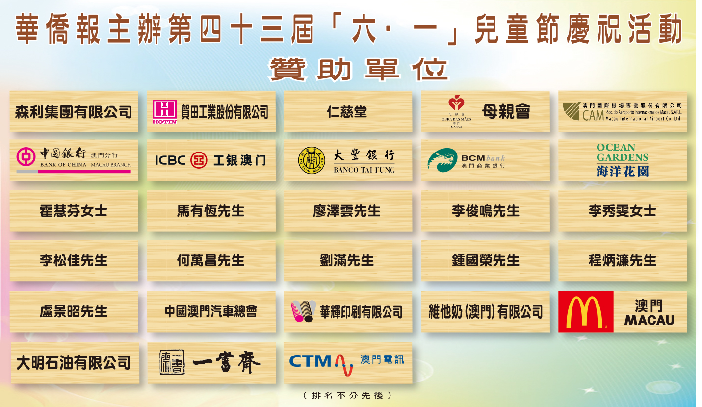 本報舉辦第四十三屆「六.一」兒童節慶祝活動,透過抽籤方式派發禮物,前四十名可獲獎學金,第四十一名至五十名則獲禮券。其他所有得獎者均可獲本報兒童節禮物一份。得獎者請於六月一日至七日上午十時至下午五時到本報營業部領取禮物,領取禮物時請攜帶澳門居民身份證及學生證,以便核對。