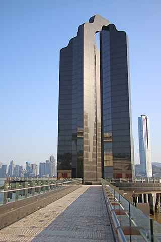 位於西灣湖堤畔對開海面約60米處的融和門,於1993年建成,由雕塑家歐美德(Chartersde Almeida)設計,參考中國四合院各有一道門,通過門可驅除邪惡,迎接良善的到來;通過四面石面映照,接受晨曦和夕陽的光影投射,產生優美畫面,意謂東西融合與貫通。(圖為融和門,攝於2022年4月3日)