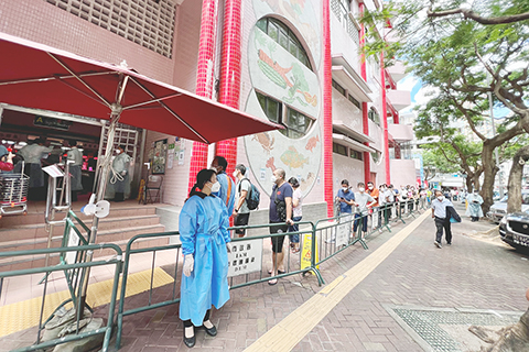 祐漢街市和沙梨頭街市外圍均已拉起分隔帶,沙梨頭街市在隊尾設指示牌,明確區分進入街市和核酸檢測的排隊區域。此外,沙梨頭街市附近設有臨時紅街市,市政署呼籲居民可前往以達到分流作用。