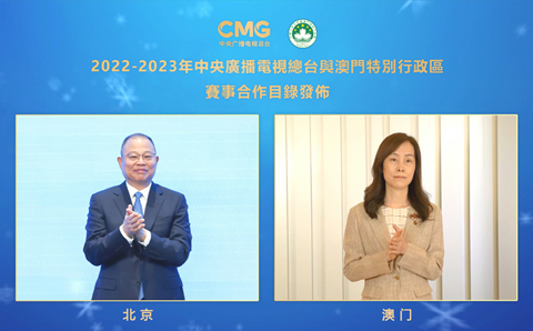 澳門特別行政區社會文化司司長歐陽瑜與中央廣播電視總台編務會議成員薛繼軍共同發佈了《二0二二至二0二三年中央廣播電視總台與澳門特別行政區賽事合作目錄》,雙方將進一步強化在體育賽事舉辦和賽事資源授權方面的合作。