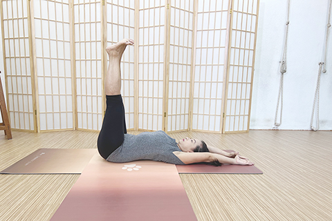 在呼氣的同時,把雙臂伸展過頭,配合數個自然呼吸。呼氣,將雙腿提起抬高至三十度,之後加至六十度,各保持五秒,以鼻呼吸。再呼氣,放低雙腿回到地面,放鬆。〔如圖二〕