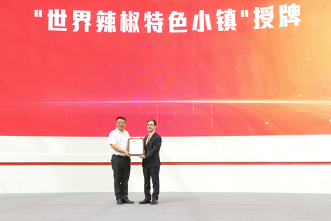 【中新社貴州遵義八月二十八日電】(袁超、瞿宏倫)第七屆貴州.遵義國際辣椒博覽會二十八日在遵義市新蒲新區開幕,世界辣椒聯盟秘書長張盧卡宣讀世界辣椒聯盟認定文件,貴州省遵義市蝦子鎮被授予「世界辣椒特色小鎮」。