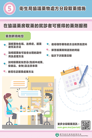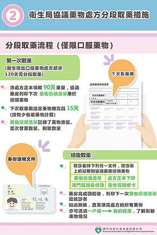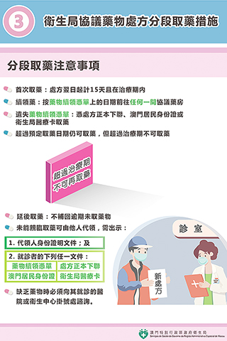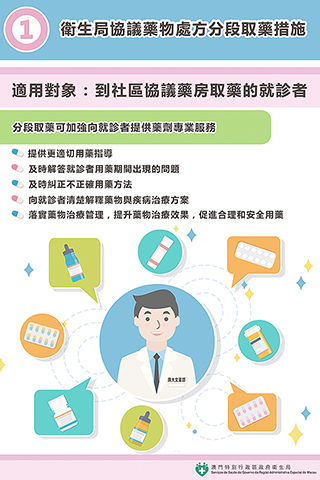 衛生局表示,居民亦可透過「協議藥物處方分段取藥措施」資訊專頁(網址:https://www.ssm.gov.mo/apps1/StagedMedicineSupply/ch.aspx)查閱有關的圖文包及宣傳短片,了解更多關於分段取藥措施的詳情。◇