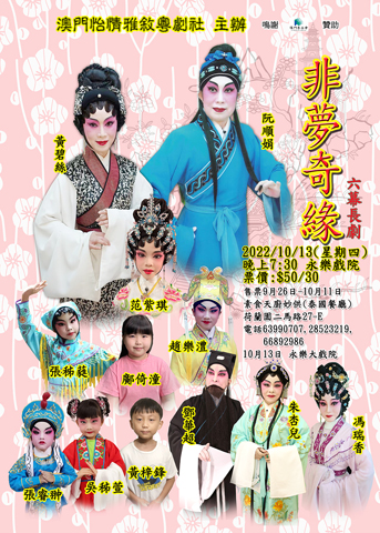 澳門怡情雅敘粵劇社於10月13日(周四)晚上七時三十分假永樂戲院一院,選演六幕任白經典名劇《非夢奇緣》。門票分50元及30元。門票由9月26日至10月11日在素食天廚妙供(泰國餐廳)代售,地址:荷蘭園二馬路27E,電話:28523219。本劇跟據名伶任劍輝之著名粵語電影《非夢奇緣》改編成六幕粵劇。由澳門著名資深撰曲人陳志梅及年輕掌板師傅鄧子健編劇。劇情輕鬆惹笑,歌曲悅耳動聽,邀請多名兒童飾演村童,展示天真活潑的童真,也可培養粵劇的接班人。聯同本澳粵劇發燒友,共同打造一齣好戲,獻給本澳居民。