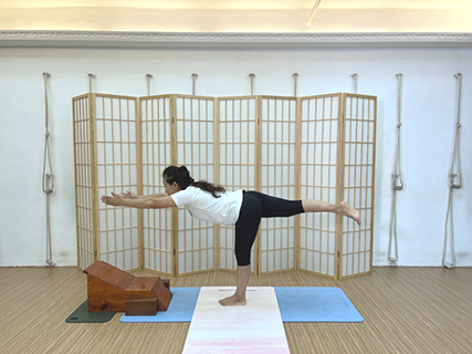 從單腿站立的戰士三式,再到張開上手的飛機式,之後刊慢慢退回來到地上的戰士一式,保持動作十至二十秒。之後再換邊。