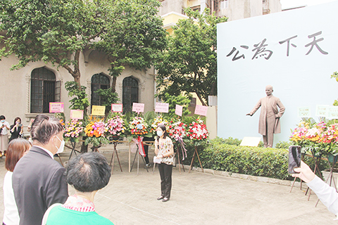 國父銅像致敬典禮昨午一時於國父紀念館花園舉行,台北經濟文化辦事處秘書劉明致辭時稱,國父孫中山先生致力國民革命,創建亞洲第一個民主共和國,在台灣歷經多年政治民主化及經濟自由化的進程後,可以說已經具體實踐了中山先生窮盡一生所追求的民有、民治、民享理念。國父孫中山先生的家族就曾在我們現在所站的這個地方安身長居,由於這個與別不同的歷史連結,使得台灣與澳門結緣甚深,兩地的交流也更顯親切與緊密。今天,在配合防疫規範下,一起在澳門國父紀念館向國父致敬,共同緬懷當年辛亥革命起義的偉大事蹟,格外具有意義。