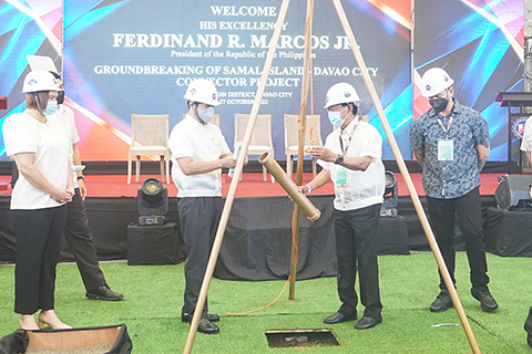菲律賓達沃-薩馬爾島大橋項目開工儀式 2022-10-28 03:30:00 ◎ 當地時間十月二十七日,中菲政府間合作旗艦項目達沃-薩馬爾島大橋項目開工儀式在菲律賓達沃舉行。圖為開工儀式上,出席嘉賓共同埋下時間膠囊,相約於二0二七年大橋通車時再相聚。(中新社)