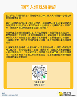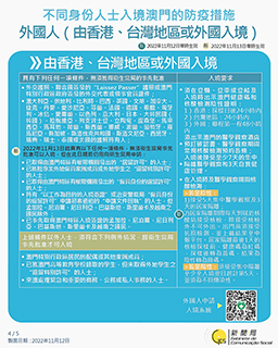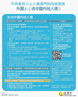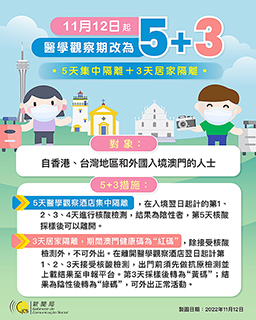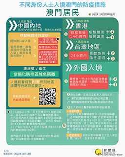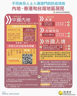 新型冠狀病毒感染應變協調中心宣佈,因應內地的疫情變化,衛生局根據第2/2004號法律《傳染病防治法》第10條和第14條的規定,自2022年11月13日凌晨1時起,新增或取銷對曾到內地相關區域人士的防疫措施: